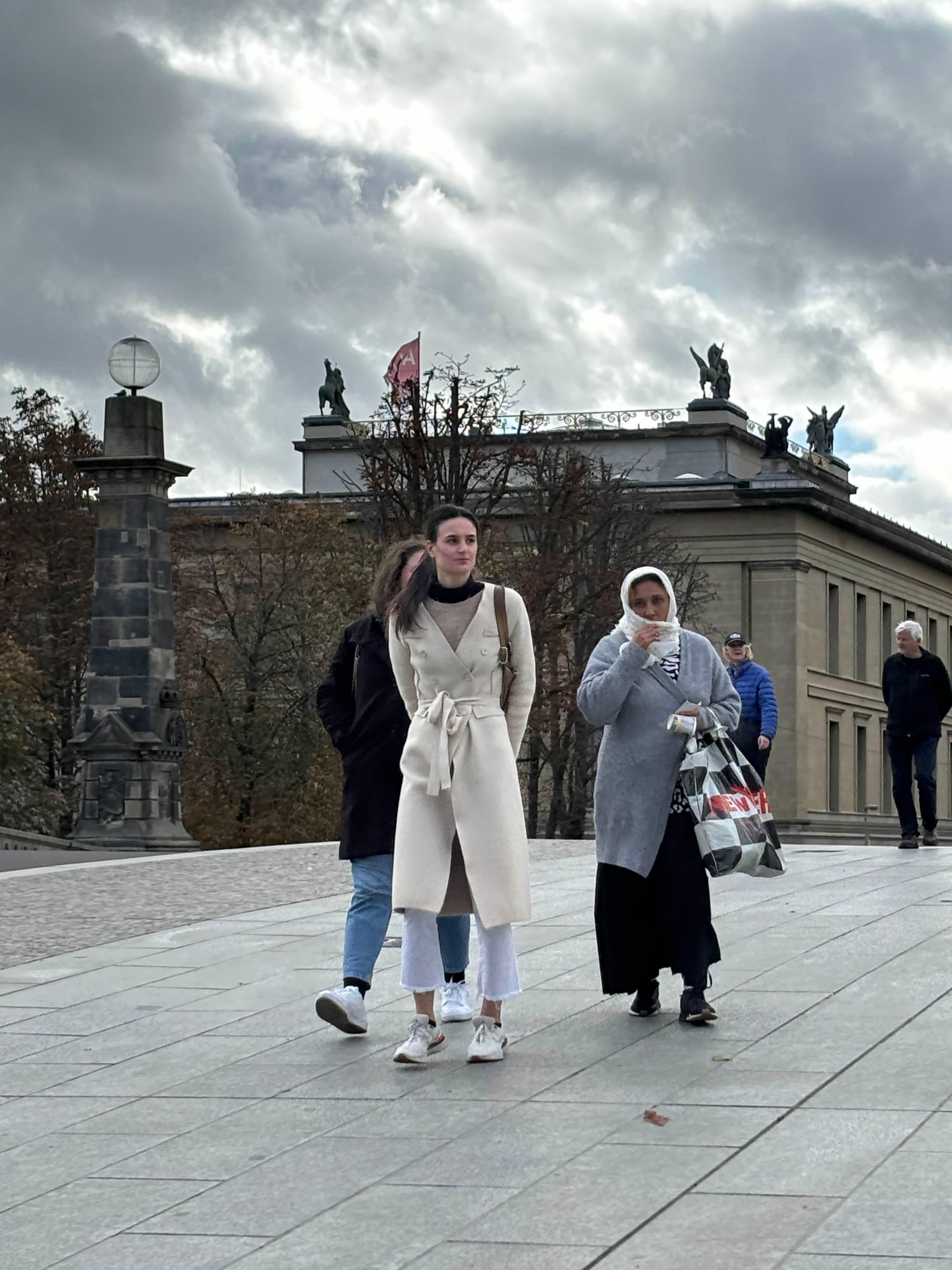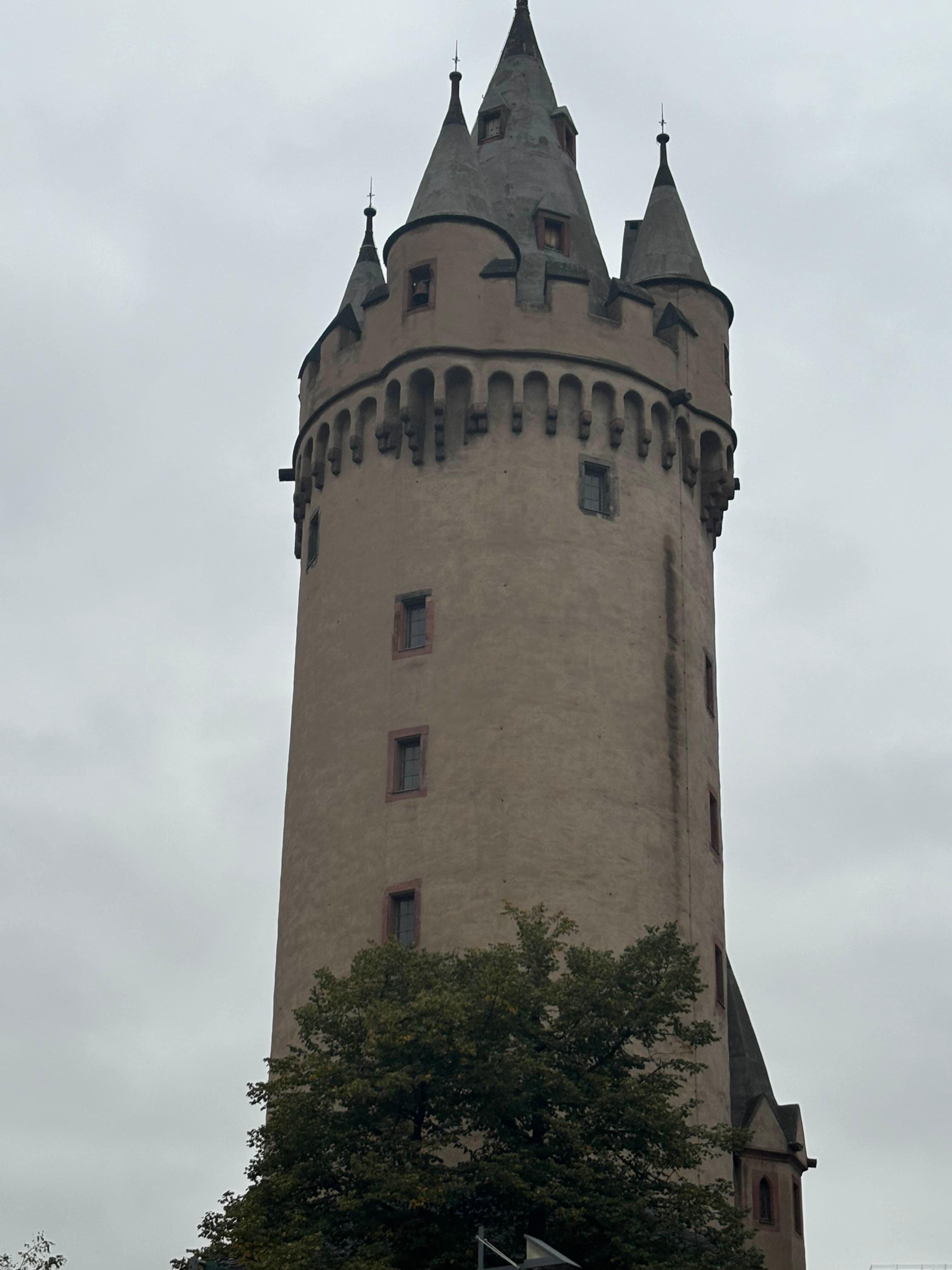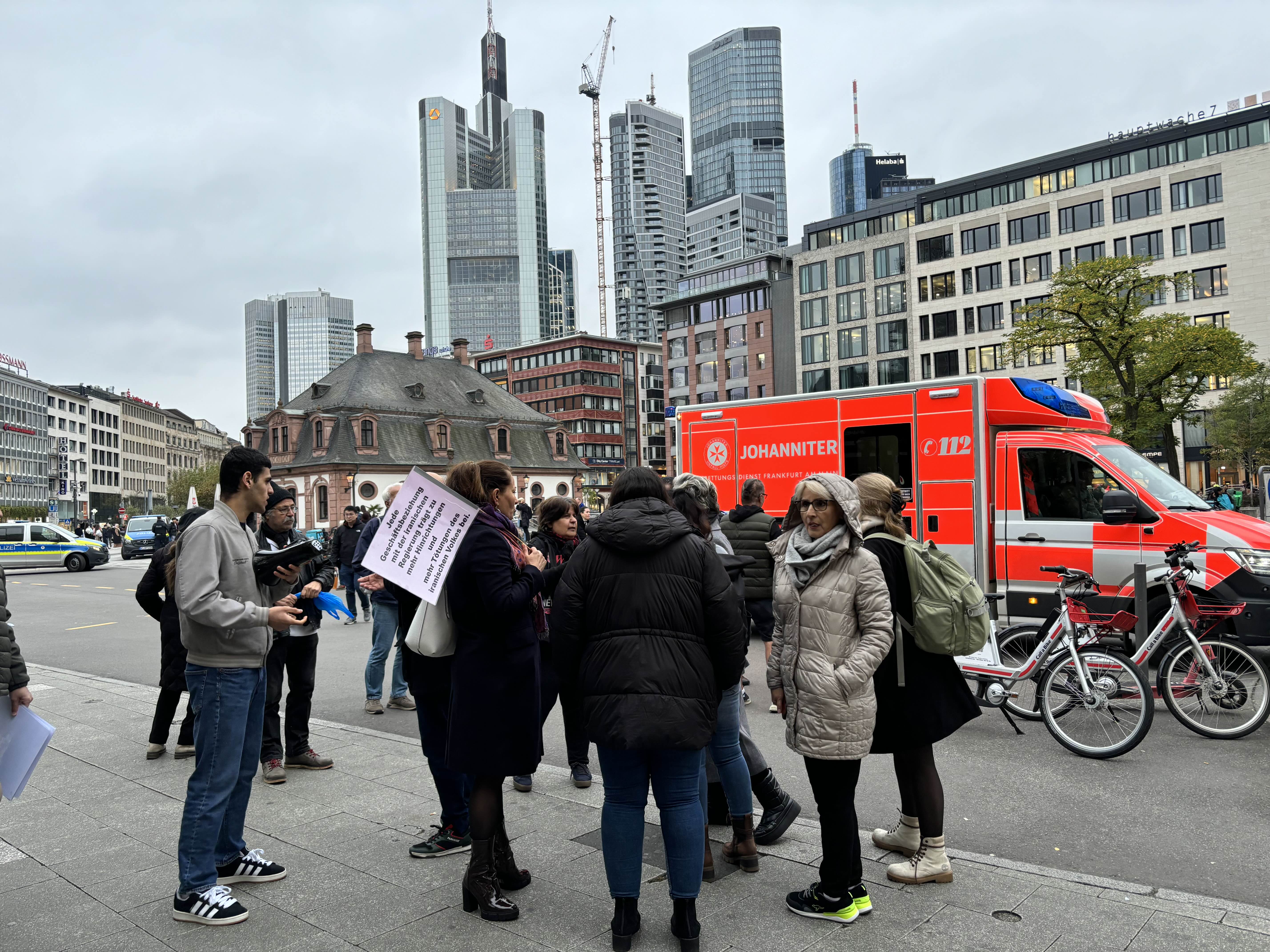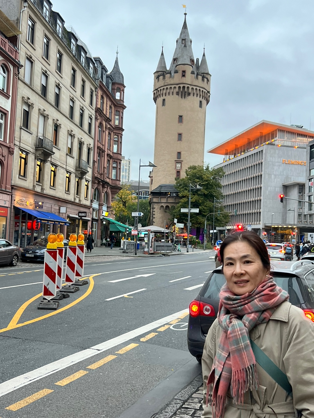 시나몬빵과  허브차 (이름이 우덴 린덴 - caffeine -free organic tea , made of linden, elderflower and apple)를 마신다. 응 맛있다. 바로 코 앞에 너무나 귀엽고 사랑스러운 중세건물 (에센하이머 탑 카페)이 찻길에 있다. 고층건물들이 사방으로 쭉쭉 올라가 있는데 웬 중세건물이지. 생경하지 않으면서도 조화롭게 서로를 배경 삼아 함께 존재하는 게 보기에 좋다. 1828년에 완성된 첨탑 5개 가 꼭대기에 예쁘게 있는 중세의 건물이 카페로 사용되고 있다. 몇 걸음 더 가니 하우프트바헤 광장이 있다. 이 주변이 프랑크푸르트의 교통의 요충지. 여기서 다른 교통편으로 환승한다고. 이란여성의 인권을 위한 가두시위가 열리고 있다. 경찰들이 호위를 하고 있는 모습이 보인다. 삶은 정치와 너무나 가깝게 있다. 살아있음이 여기도 삶이 계속되고 있음이 실감 난다. 중세적인