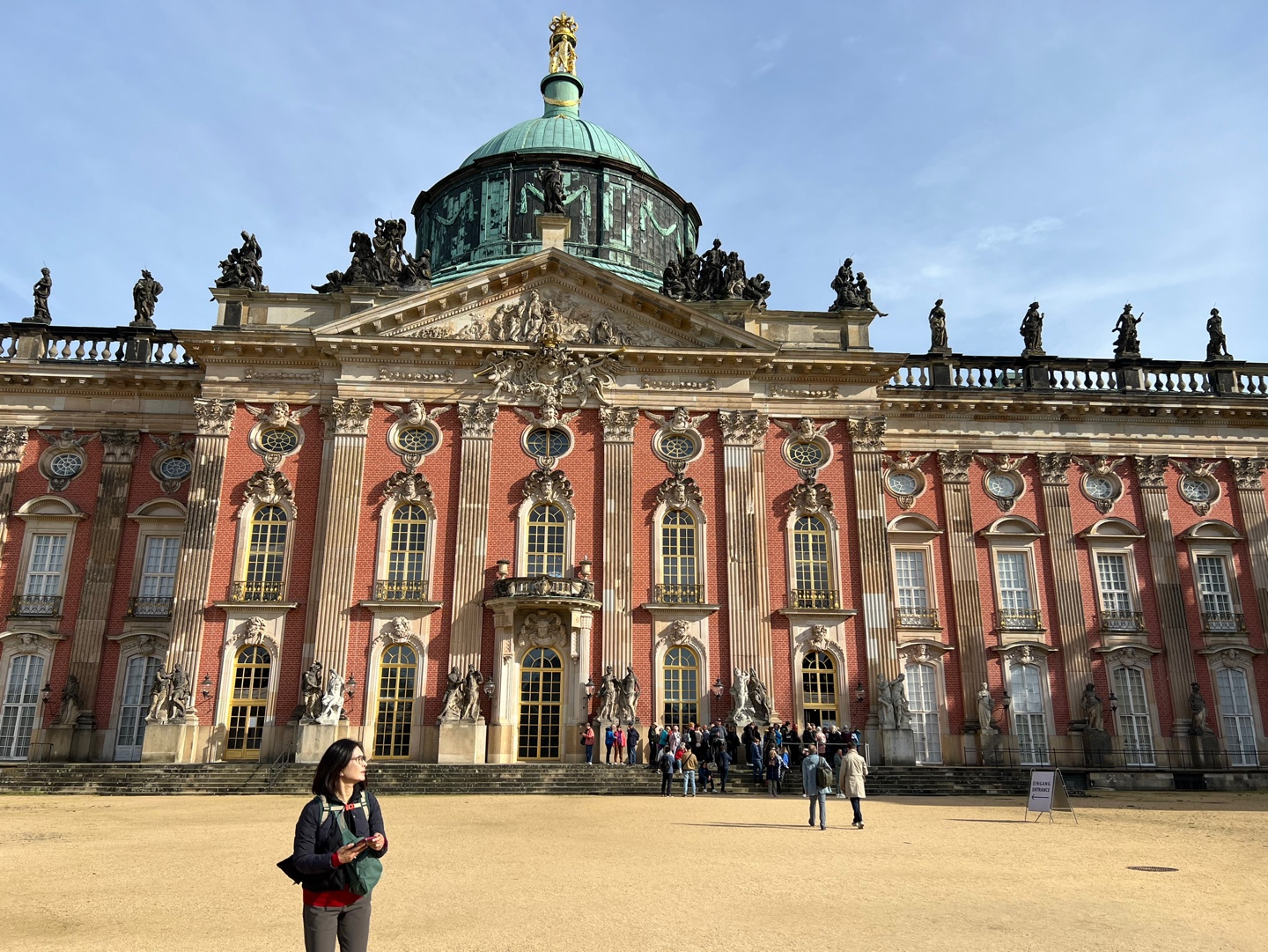 이곳은 1990년 유네스코 문화유산목록에 포함되었다. 먼저 티켓팅을 했는데 전체공원과 궁전을 볼 생각으로 1인당 22유로짜리를 샀다. Timeslot이 있어 상수리 옛 궁전을 12시 50분에 신궁전은 2시로 볼 생각이었다. 사실 이 시간에 광대한 지역에 널리 퍼져있는 상수리 궁전의 모든 곳을 관람할 수 없다. 하루도 부족할 듯하다. 상수시 궁전을 보고 신궁전을 보기 위해 걸어서 숲길을 통과 약 1.4킬로나 되는 길을 계산해야 하는데 결국 뛰어가다 시 피해서 신궁전에 5분 늦게 도착했는데 입구에서 관리인이 야멸차게 1시간 투어로 진행되는 궁전입장을 할 수 없다고 한다. 대체나 티켓 아래에 In case of late arrivls, entr can’t be accepted”라는 문구가 있다. 우기고 우겨서 다시 Timeslot을 3시 30분으로 티켓오피스에서 바꿔 겨우 1시간 투어를 할 수 있었다.