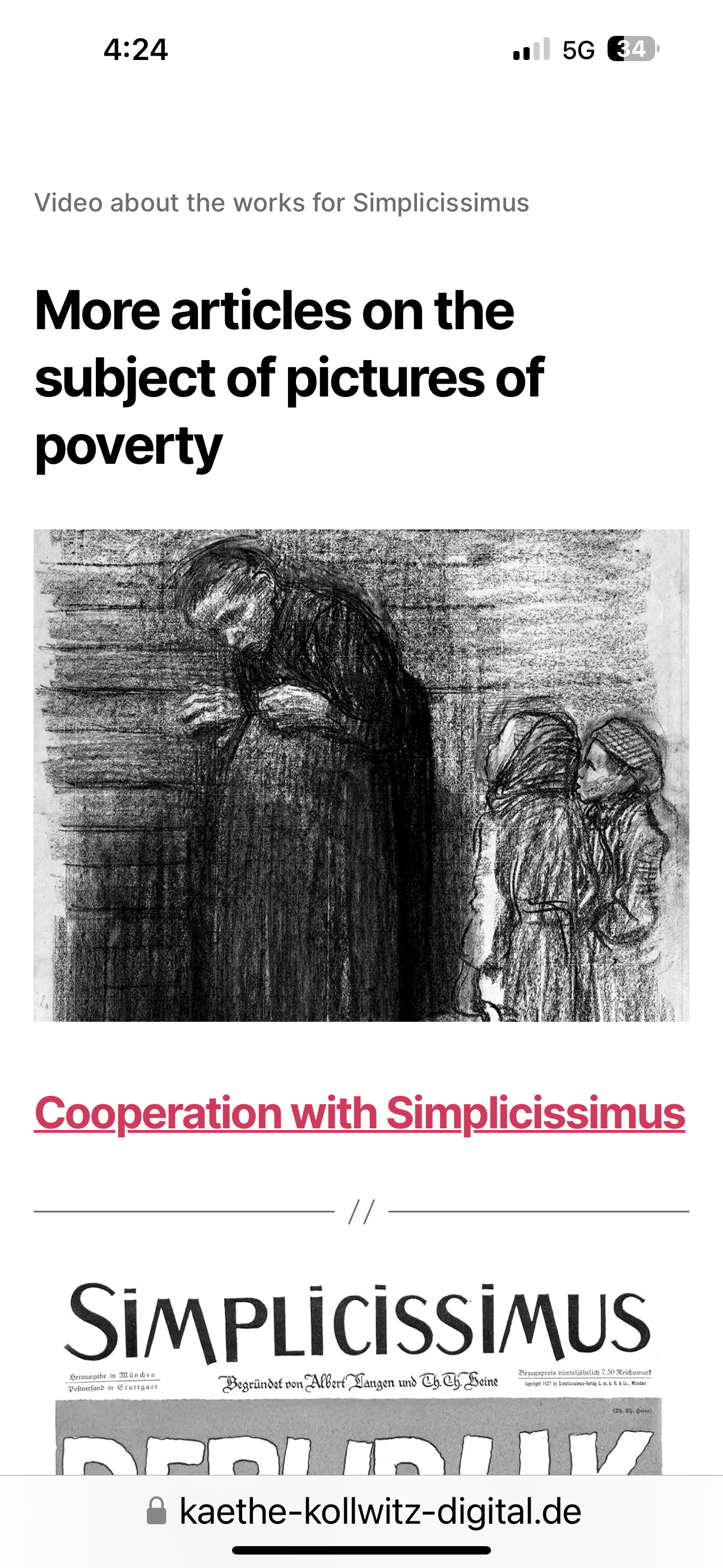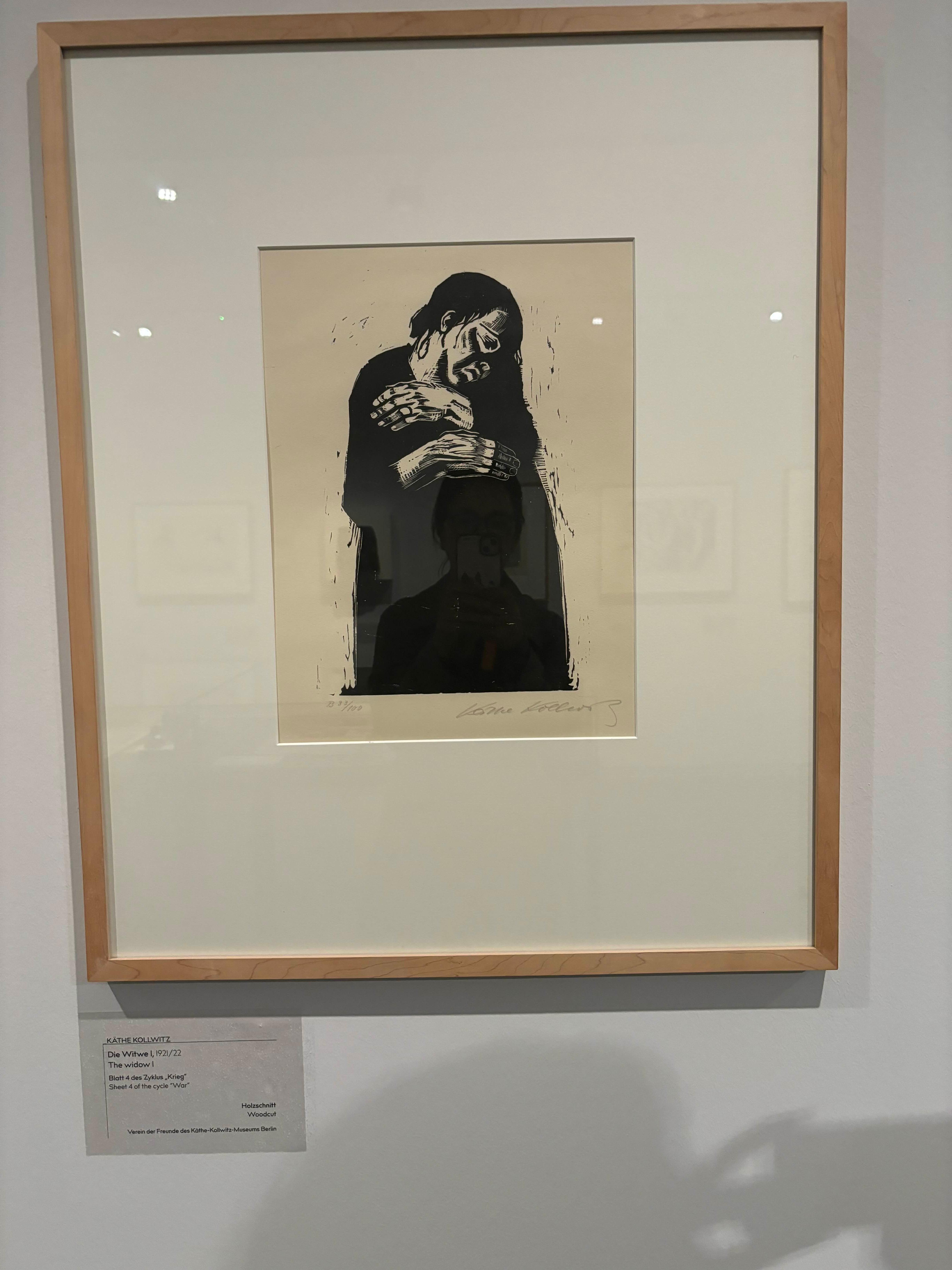2층짜리 단아한 크림색 빌딩. 확장이전을 할 계획인가보다. 공사 중이지만 개관을 해서 티켓을 사서 천천히 그녀의 작품들을 감상한다. 1년 전인가. 제주 포도박물관에서 케테 콜비츠 특별 전시를 보았다. 그때의 감동이 오랫동안 내 마음속에 남아있다. 그리고 그녀의 작품집을 사기도 했다. 실제 그녀가 태어난 베를린에 와서 박물관에 전시된 그녀의 작품들을 보니 너무 기뻤다. 케테 콜비츠( 1867-1945)는 20세기 여성 화가 중 가장 강력한 예술적 언어로 당대 그녀가 살았던 현실에 대한 정치적인 목소리를 실었고 소외되고 비참한 삶을 살아가는 이들에 대한 뜨거운 애정과 연대를 보여주었다. 그녀의 자화상을 비롯해 남편의 병원에 찾아온 궁핍한 환자들의 병든 모습과 그들이 실제생활에서 겪고 있는 참담한 생활모습, 가정학대와 죽음, 가난등을 표현한 작품들, 단순히 사실주의적인 작품을 넘어 현실을 바꾸어 나갈 수 있도록 그들이 연대하길 원하는 강한 선동적인 정치 팸플릿과 같은 작품들. 노동계층들의 생활상과 농민폭동, 1차 세계대전 참전 후 둘째 아들을 잃고 극심한 우울과 슬픔에 빠져있었던 시절의 고뇌를 보여주는 어두운 자화상들.