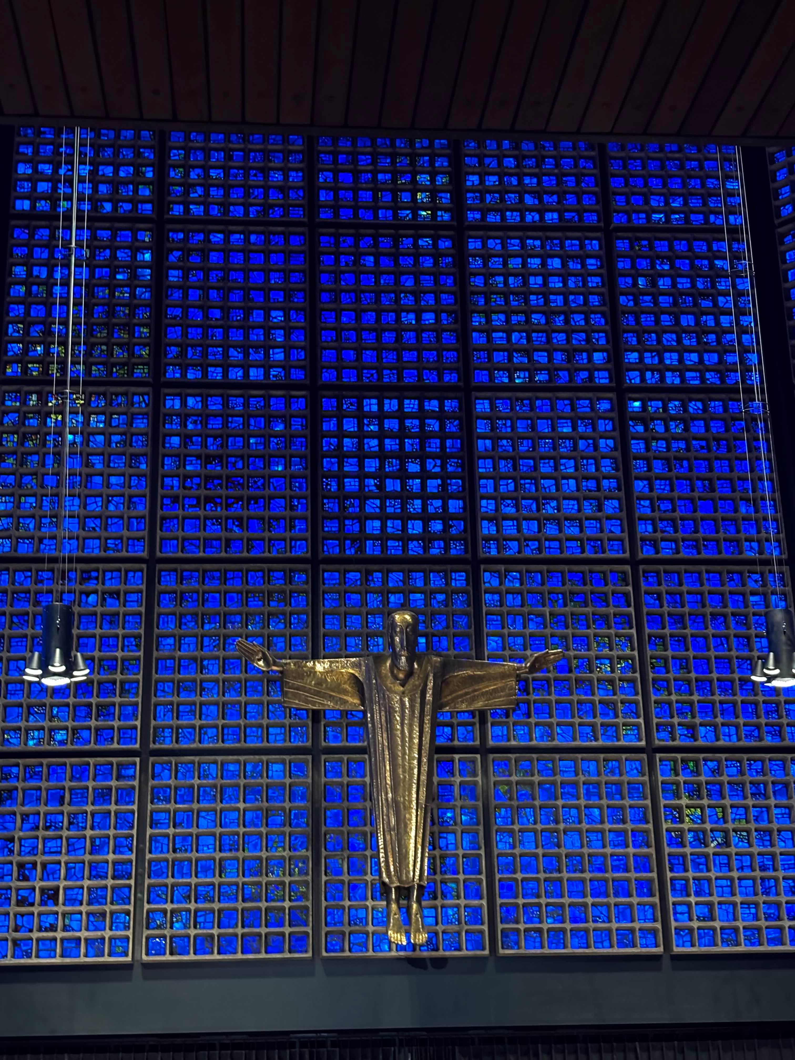 그동안 기증자들의 이름을 쓴 두루마리가 무너진 폐허 벽돌에 새겨졌고 청동명판이 멱에 설치되었다 한다. 2016년에는 12월 19일 저녁, 도난당한 트럭을 테러리스트가 크리스마스 마켓의 군중들을 향해 돌진해 12명의 사상자를 내는 비극적 사건이 있었다. 계단의 비문에는 ‘2016년 크리스마켓 테러공격의 희생자를 기리며 모든 인류의 평화로운 공존을 위해 ‘라는 비문이 있다고 한다. 1층에 있는 기념관을 둘러본다. 이 교회는 1943년 11월 22일 베를린 공습으로 파괴되어 완전히 사용될 수 없게 되었고 옛 교회의 현관을 현재 박물관으로 고쳐 기록물들을 전시하고 있다. 즉 이곳은 기억과 묵상의 공간이다. 그리고 바로 옆, The Blue Room이라는 애칭으로 불리는 신교회가 현대적인 양식으로 바로 옆에 신축되었다. 불꽃이 가장 뜨거울 때 색깔이 파란색이라 했던가. 이 교회에서 매일 1시에 파이프오르간을 연주한다. 전체공간이 파랑 스테인드글라스로 되어있는 너무나 아름답고 신비스러운 곳이다. 중앙의 예수 모습은 전형적인 예수의 모습이 아닌 인간과 묘하게 닮아 있는 모습이랄까. 감동적인 연주를 20여분을 듣고 나왔다.
